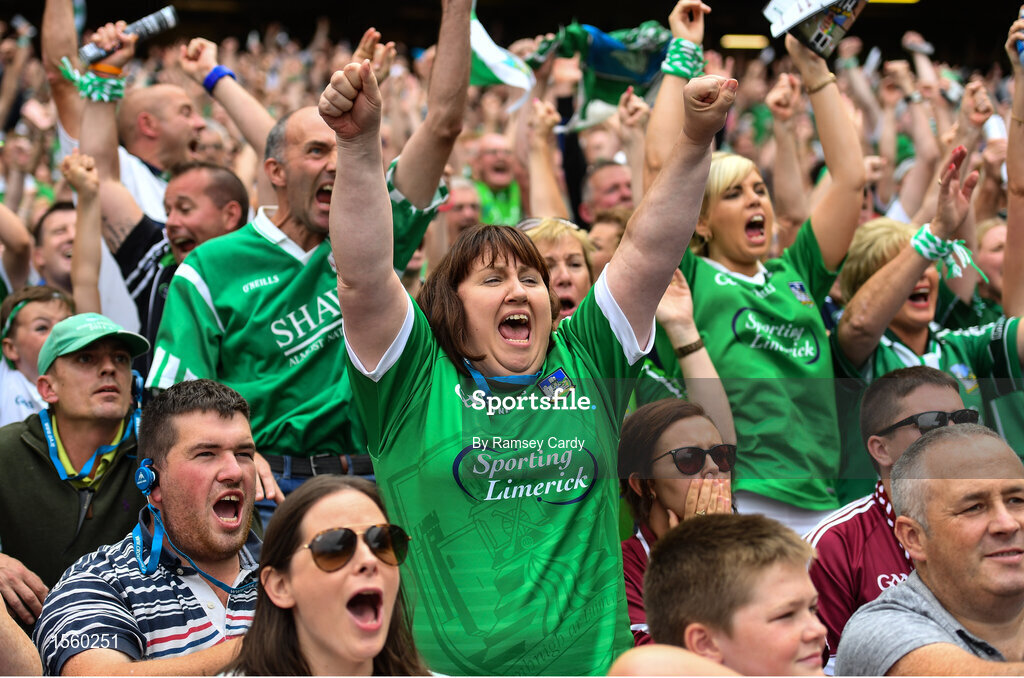 19 August 2018; Limerick supporters celebrate their side's third goal during the GAA Hurling All-Ireland Senior Championship Final match between Galway and Limerick at Croke Park in Dublin. Photo by Ramsey Cardy/Sportsfile