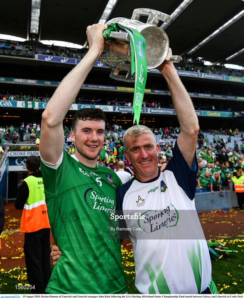 19 August 2018; Declan Hannon of Limerick and Limerick manager John Kiely following the GAA Hurling All-Ireland Senior Championship Final match between Galway and Limerick at Croke Park in Dublin. Photo by Ramsey Cardy/Sportsfile