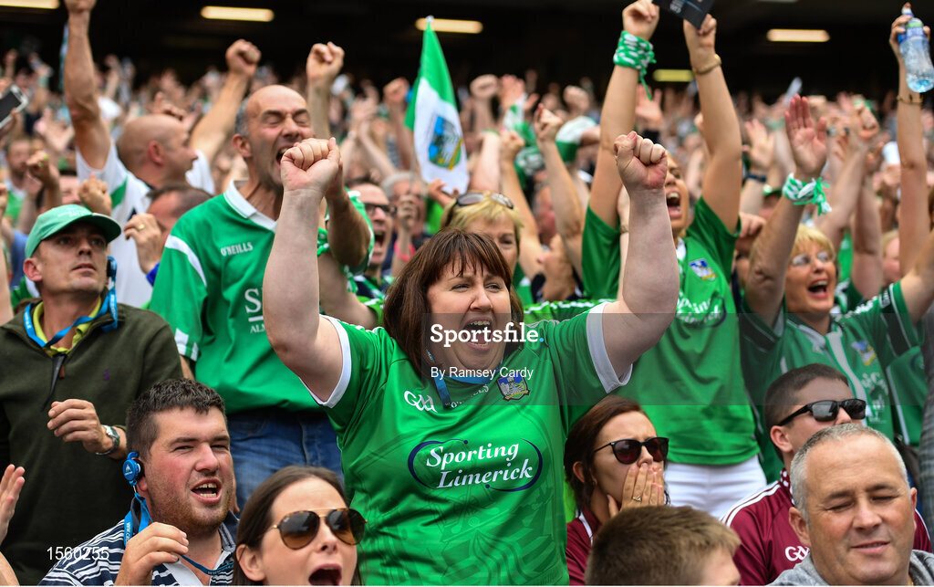 19 August 2018; Limerick supporters celebrate their side's third goal during the GAA Hurling All-Ireland Senior Championship Final match between Galway and Limerick at Croke Park in Dublin. Photo by Ramsey Cardy/Sportsfile
