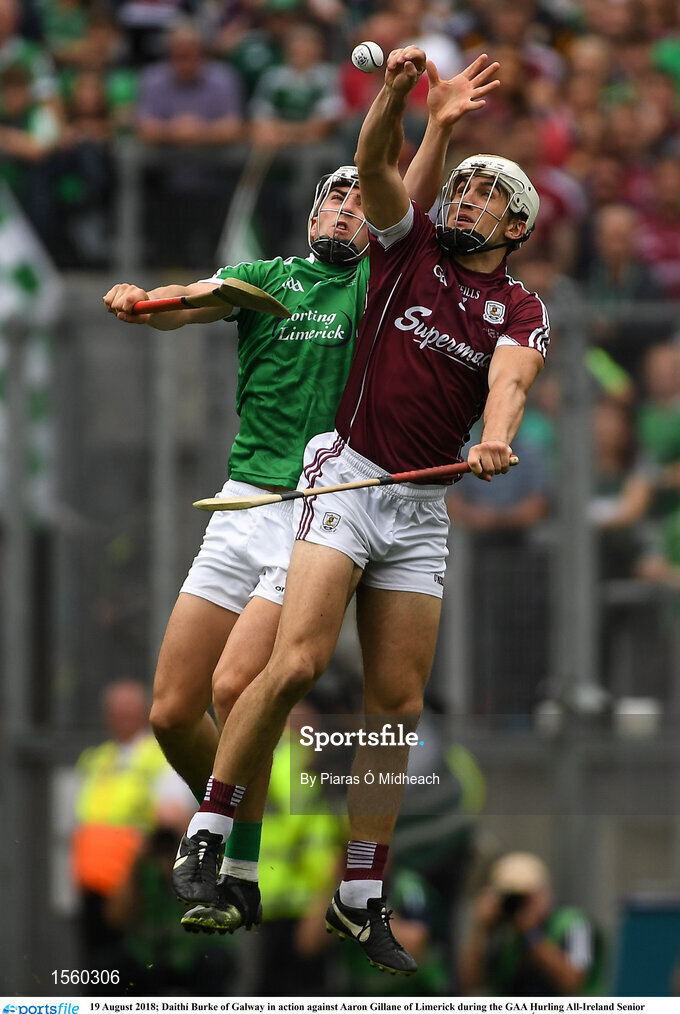 19 August 2018; Daithí Burke of Galway in action against Aaron Gillane of Limerick during the GAA Hurling All-Ireland Senior Championship Final match between Galway and Limerick at Croke Park in Dublin. Photo by Piaras Ó Mídheach/Sportsfile