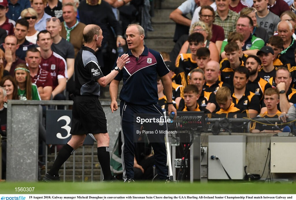 19 August 2018; Galway manager Micheál Donoghue in conversation with linesman Seán Cleere during the GAA Hurling All-Ireland Senior Championship Final match between Galway and Limerick at Croke Park in Dublin. Photo by Piaras Ó Mídheach/Sportsfile