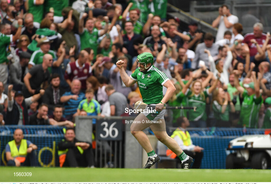 19 August 2018; Shane Dowling of Limerick celebrates scoring his side's third goal during the GAA Hurling All-Ireland Senior Championship Final match between Galway and Limerick at Croke Park in Dublin. Photo by Piaras Ó Mídheach/Sportsfile