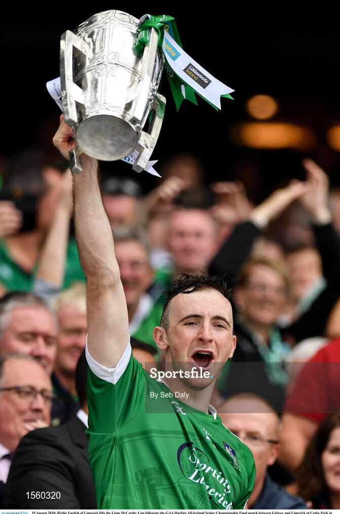 19 August 2018; Richie English of Limerick lifts the Liam MacCarthy Cup following the GAA Hurling All-Ireland Senior Championship Final match between Galway and Limerick at Croke Park in Dublin. Photo by Seb Daly/Sportsfile