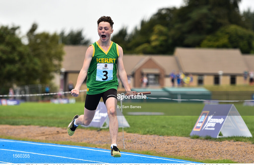 19 August 2018; Dara Looney of Killarney South, Co. Kerry, on celebrates winning the U14 & O12 Boys Relay event during day two of the Aldi Community Games August Festival at the University of Limerick in Limerick. Photo by Sam Barnes/Sportsfile
