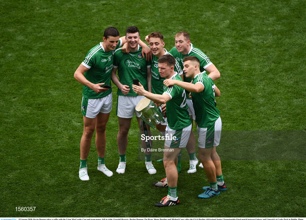19 August 2018; Kevin Downes takes a selfie with the Liam MacCarthy Cup and team-mates, left to right, Gearóid Hegarty, Declan Hannon, Pat Ryan, Shane Dowling and Michael Casey after the GAA Hurling All-Ireland Senior Championship Final match between Galway and Limerick at Croke Park in Dublin. Photo by Daire Brennan/Sportsfile