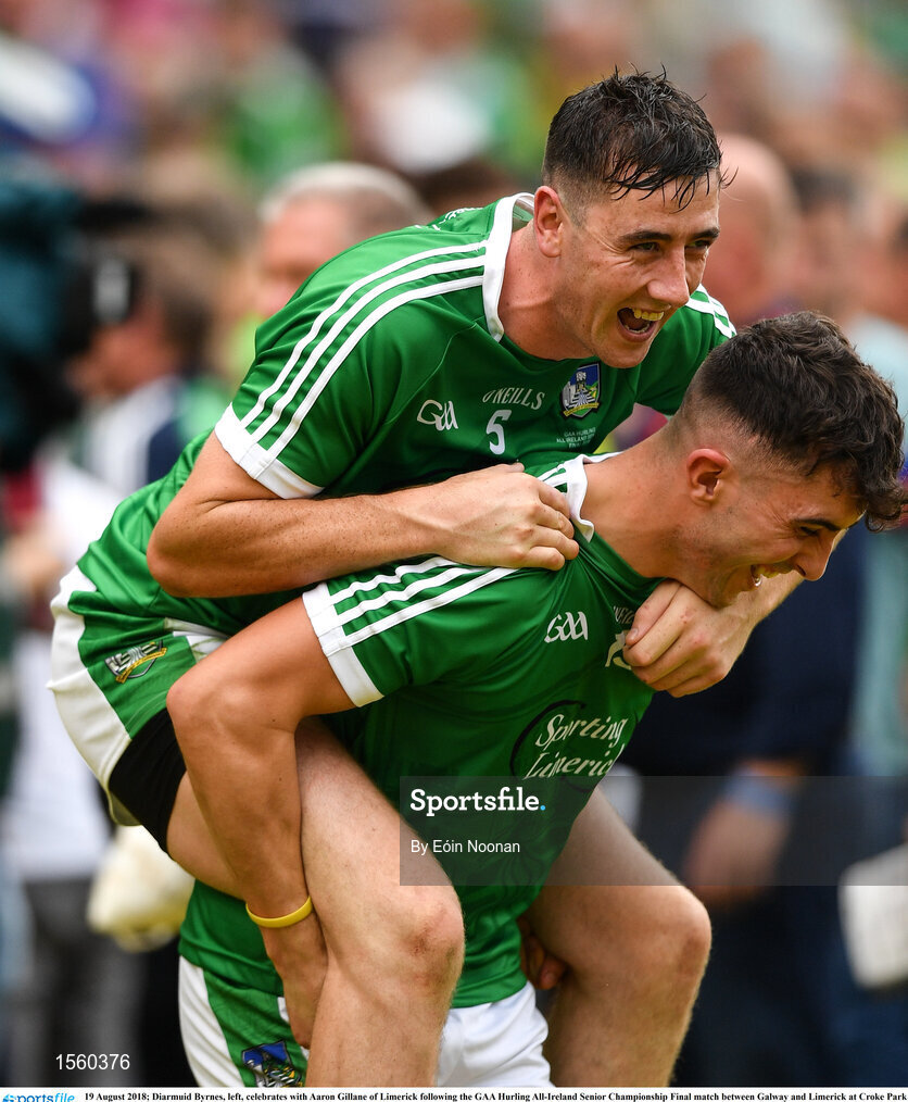 19 August 2018; Diarmaid Byrnes, left, celebrates with Aaron Gillane of Limerick following the GAA Hurling All-Ireland Senior Championship Final match between Galway and Limerick at Croke Park in Dublin. Photo by Eóin Noonan/Sportsfile
