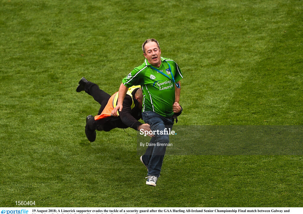 19 August 2018; A Limerick supporter evades the tackle of a security guard after the GAA Hurling All-Ireland Senior Championship Final match between Galway and Limerick at Croke Park in Dublin. Photo by Daire Brennan/Sportsfile