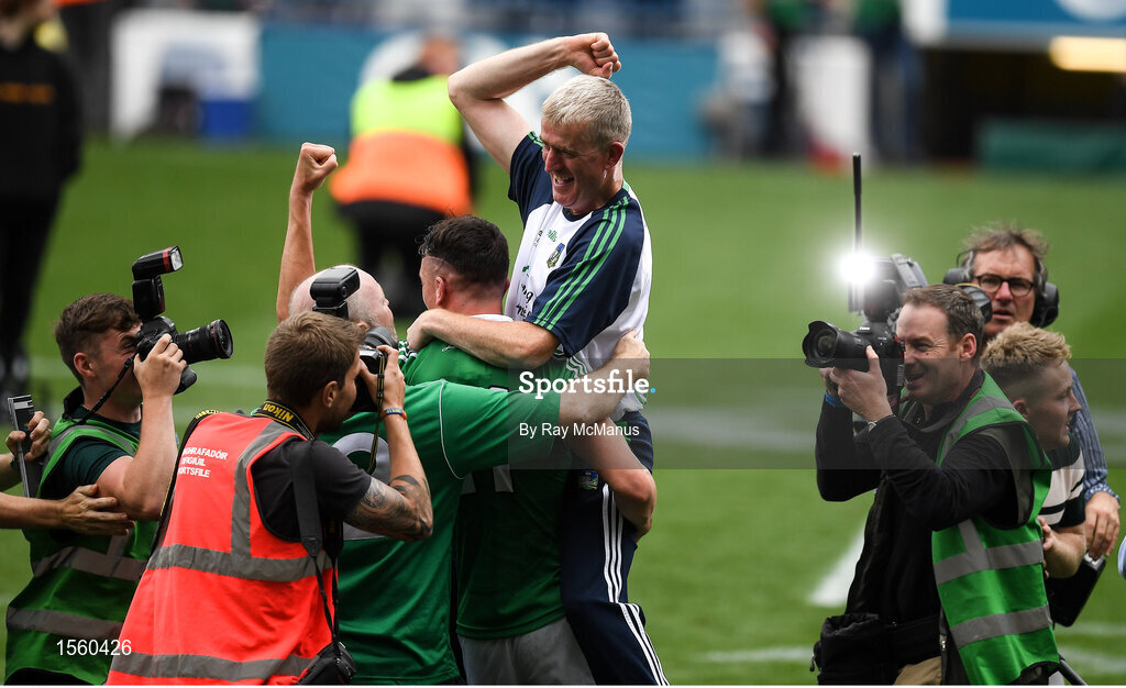 19 August 2018; Limerick manager John Kiely is the centre of celebrations after the GAA Hurling All-Ireland Senior Championship Final match between Galway and Limerick at Croke Park in Dublin. Photo by Ray McManus/Sportsfile