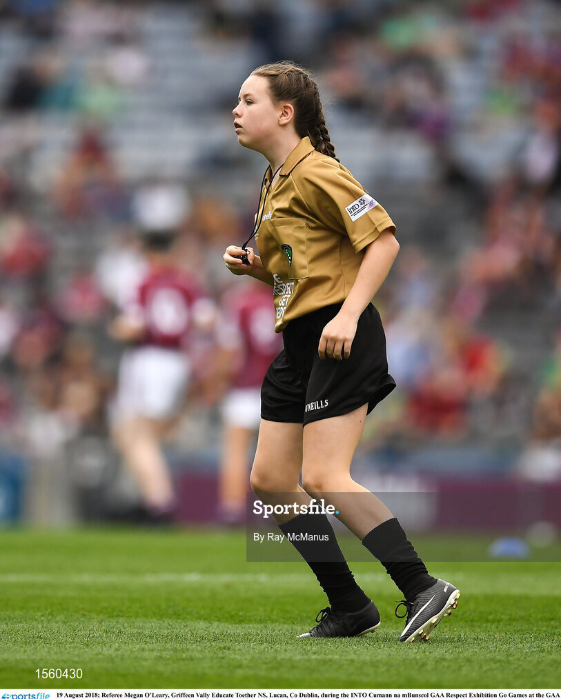 19 August 2018; Referee Megan O’Leary, Griffeen Vally Educate Together NS, Lucan, Co Dublin, during the INTO Cumann na mBunscol GAA Respect Exhibition Go Games at the GAA Hurling All-Ireland Senior Championship Final match between Galway and Limerick at Croke Park in Dublin. Photo by Ray McManus/Sportsfile