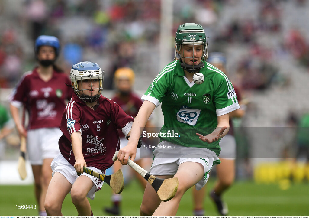 19 August 2018; Ella Ní Chathail, Gaelscoil Mhichil Ciosog, Inis, Clare, representing Limerick, and Ciara Ryan, Mercy Convent NS, Naas, Co Kildare, representing Galway, during the INTO Cumann na mBunscol GAA Respect Exhibition Go Games at the GAA Hurling All-Ireland Senior Championship Final match between Galway and Limerick at Croke Park in Dublin. Photo by Ray McManus/Sportsfile