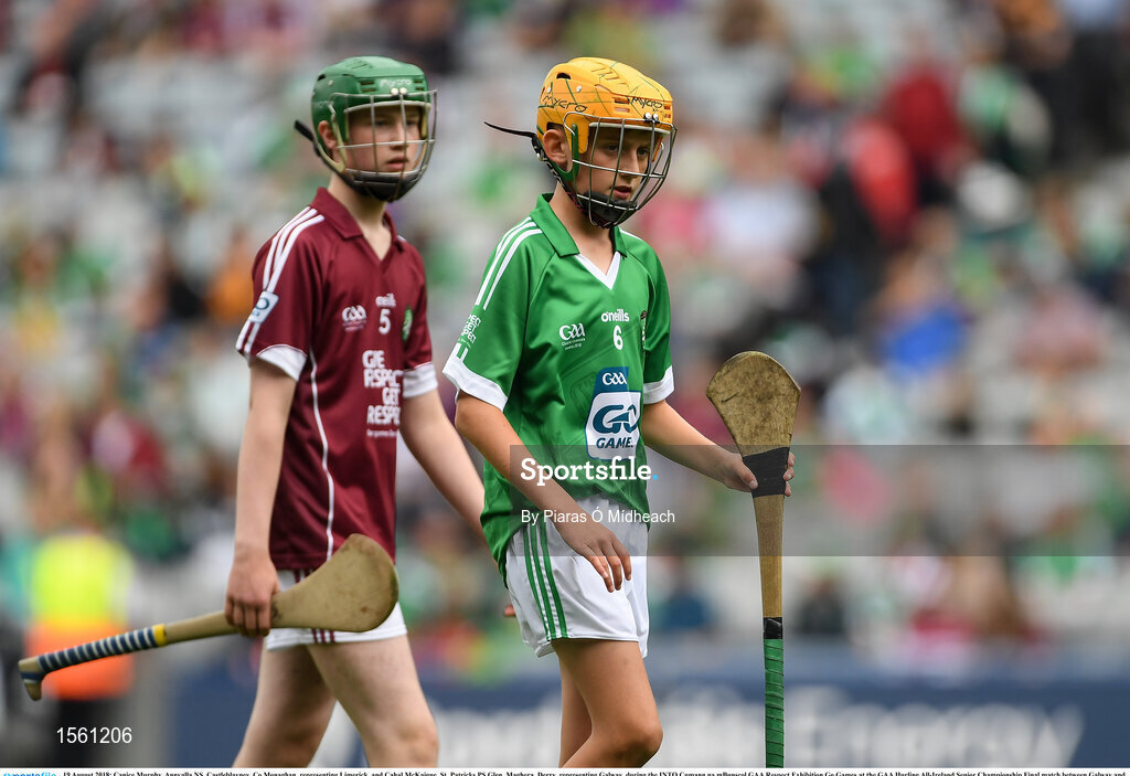 19 August 2018; Canice Murphy, Annyalla NS, Castleblayney, Co Monaghan, representing Limerick, and Cahal McKaigue, St. Patricks PS Glen, Maghera, Derry, representing Galway, during the INTO Cumann na mBunscol GAA Respect Exhibition Go Games at the GAA Hurling All-Ireland Senior Championship Final match between Galway and Limerick at Croke Park in Dublin. Photo by Piaras Ó Mídheach/Sportsfile