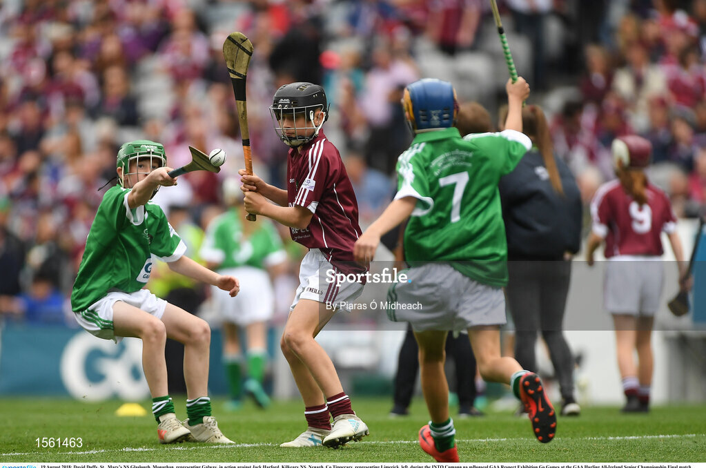 19 August 2018; James Sargent, St Brigid’s PS, Knockloughrim, Co.Derry, representing Galway, in action against Jack Harford, Kilkeary NS, Nenagh, Co Tipperary, representing Limerick, left, during the INTO Cumann na mBunscol GAA Respect Exhibition Go Games at the GAA Hurling All-Ireland Senior Championship Final match between Galway and Limerick at Croke Park in Dublin. Photo by Piaras Ó Mídheach/Sportsfile