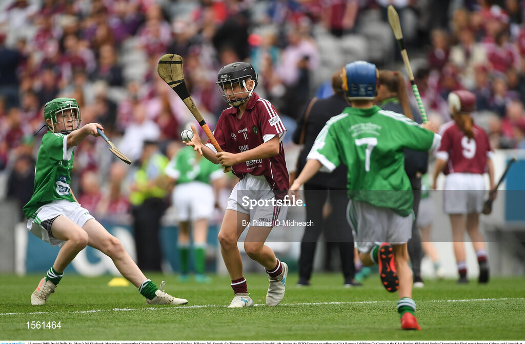 19 August 2018; James Sargent, St Brigid’s PS, Knockloughrim, Co.Derry, representing Galway, in action against Jack Harford, Kilkeary NS, Nenagh, Co Tipperary, representing Limerick, left, during the INTO Cumann na mBunscol GAA Respect Exhibition Go Games at the GAA Hurling All-Ireland Senior Championship Final match between Galway and Limerick at Croke Park in Dublin. Photo by Piaras Ó Mídheach/Sportsfile