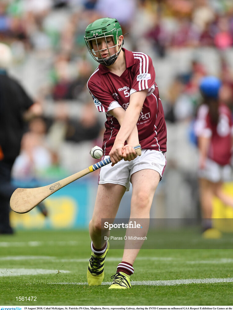 19 August 2018; Cahal McKaigue, St. Patricks PS Glen, Maghera, Derry, representing Galway, during the INTO Cumann na mBunscol GAA Respect Exhibition Go Games at the GAA Hurling All-Ireland Senior Championship Final match between Galway and Limerick at Croke Park in Dublin. Photo by Piaras Ó Mídheach/Sportsfile