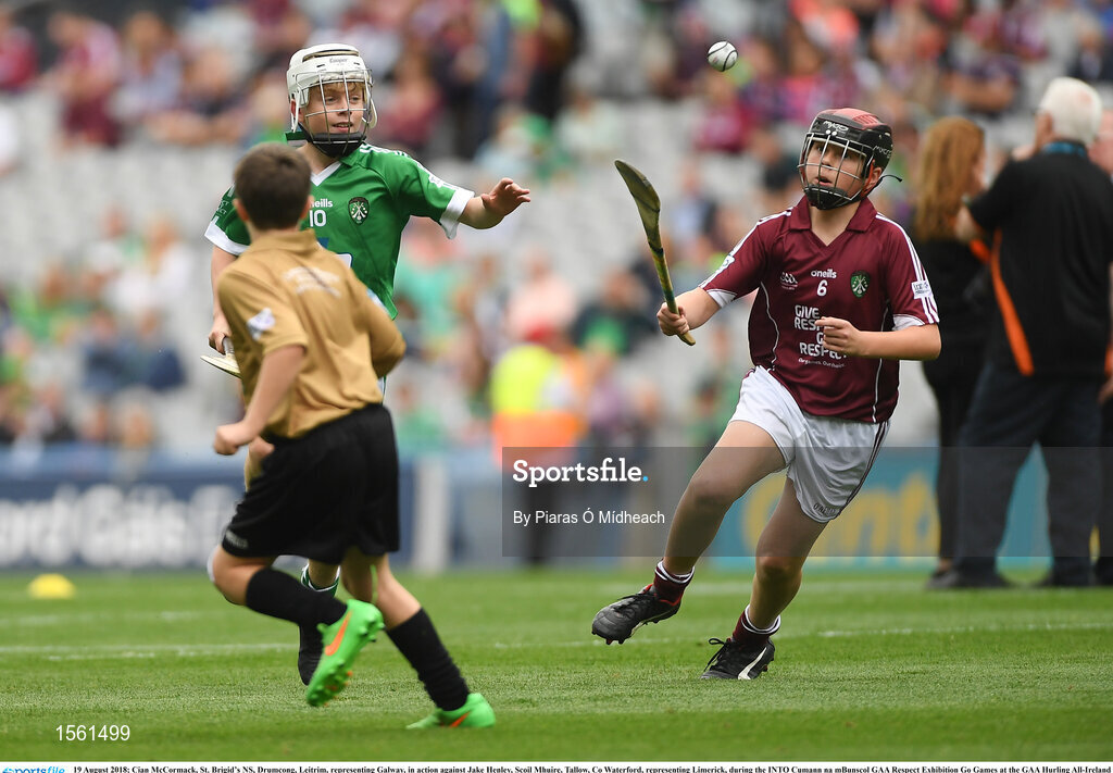 19 August 2018; Cian McCormack, St. Brigid’s NS, Drumcong, Leitrim, representing Galway, in action against Jake Henley, Scoil Mhuire, Tallow, Co Waterford, representing Limerick, during the INTO Cumann na mBunscol GAA Respect Exhibition Go Games at the GAA Hurling All-Ireland Senior Championship Final match between Galway and Limerick at Croke Park in Dublin. Photo by Piaras Ó Mídheach/Sportsfile