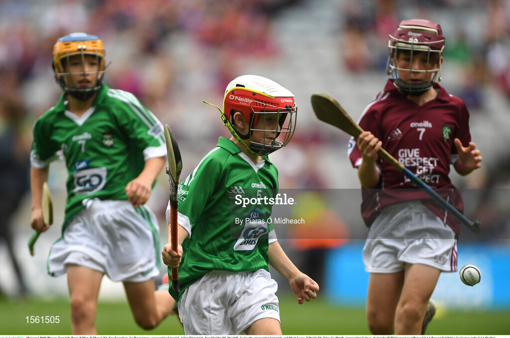 19 August 2018; Players, from left, Barry Killion, St Mary’s NS, Knockcroghery, Co Roscommon, representing Limerick, Aidan Fitzpatrick, Knockbridge NS, Dundalk, Co Louth, representing Limerick, and Mark Leavy, Kilbride NS, Trim, Co Meath, representing Galway, during the INTO Cumann na mBunscol GAA Respect Exhibition Go Games at the GAA Hurling All-Ireland Senior Championship Final match between Galway and Limerick at Croke Park in Dublin. Photo by Piaras Ó Mídheach/Sportsfile