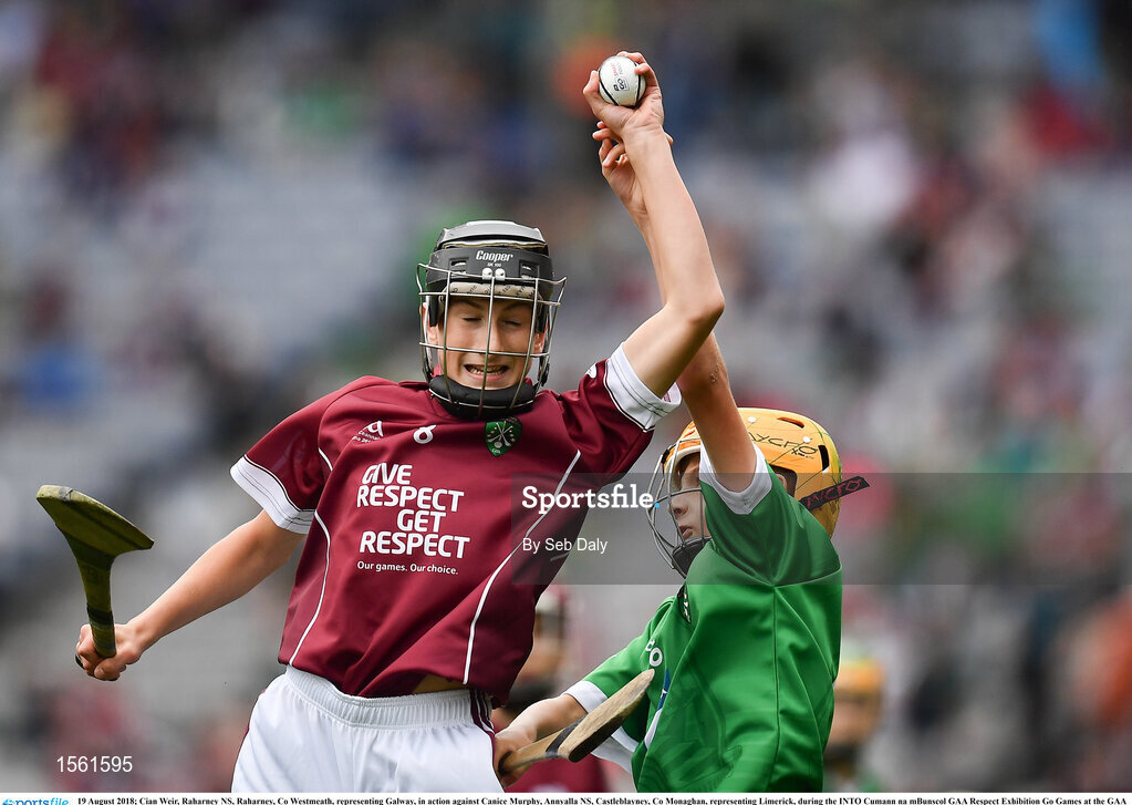 19 August 2018; Cian Weir, Raharney NS, Raharney, Co Westmeath, representing Galway, in action against Canice Murphy, Annyalla NS, Castleblayney, Co Monaghan, representing Limerick, during the INTO Cumann na mBunscol GAA Respect Exhibition Go Games at the GAA Hurling All-Ireland Senior Championship Final match between Galway and Limerick at Croke Park in Dublin. Photo by Seb Daly/Sportsfile