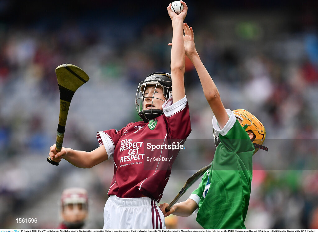 19 August 2018; Cian Weir, Raharney NS, Raharney, Co Westmeath, representing Galway, in action against Canice Murphy, Annyalla NS, Castleblayney, Co Monaghan, representing Limerick, during the INTO Cumann na mBunscol GAA Respect Exhibition Go Games at the GAA Hurling All-Ireland Senior Championship Final match between Galway and Limerick at Croke Park in Dublin. Photo by Seb Daly/Sportsfile