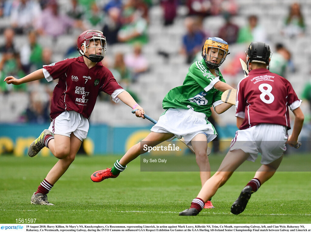 19 August 2018; Barry Killion, St Mary’s NS, Knockcroghery, Co Roscommon, representing Limerick, in action against Mark Leavy, Kilbride NS, Trim, Co Meath, representing Galway, left, and Cian Weir, Raharney NS, Raharney, Co Westmeath, representing Galway, during the INTO Cumann na mBunscol GAA Respect Exhibition Go Games at the GAA Hurling All-Ireland Senior Championship Final match between Galway and Limerick at Croke Park in Dublin. Photo by Seb Daly/Sportsfile