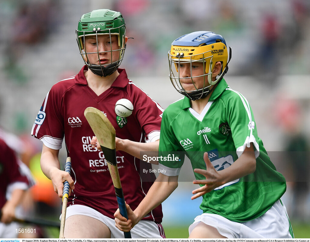 19 August 2018; Eoghan Durkan, Corballa NS, Corballa, Co Sligo, representing Limerick, in action against Seosamh Ó Loinsigh, Gaelscoil Bharra, Cabrach, Co Dublin, representing Galway, during the INTO Cumann na mBunscol GAA Respect Exhibition Go Games at the GAA Hurling All-Ireland Senior Championship Final match between Galway and Limerick at Croke Park in Dublin. Photo by Seb Daly/Sportsfile