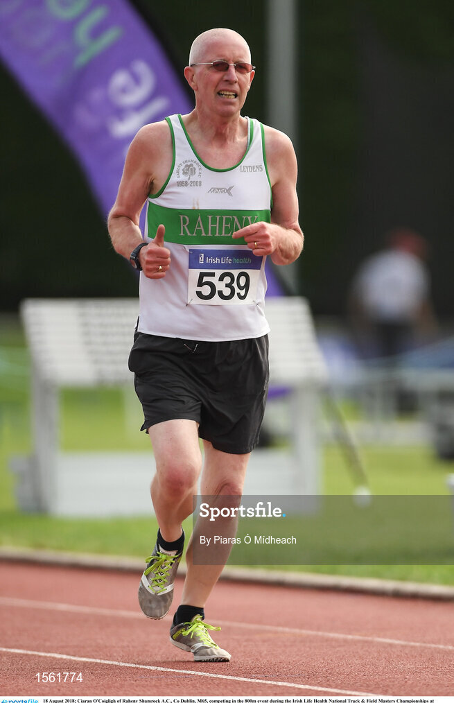 18 August 2018; Ciaran O'Coigligh of Raheny Shamrock A.C., Co Dublin, M65, competing in the 800m event during the Irish Life Health National Track & Field Masters Championships at Tullamore Harriers Stadium in Offaly. Photo by Piaras Ó Mídheach/Sportsfile
