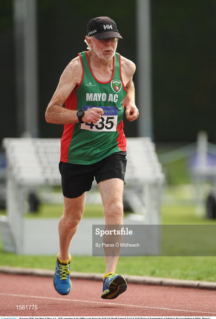 18 August 2018; Tom Hunt of Mayo A.C., M70, competing in the 1500m event during the Irish Life Health National Track & Field Masters Championships at Tullamore Harriers Stadium in Offaly. Photo by Piaras Ó Mídheach/Sportsfile