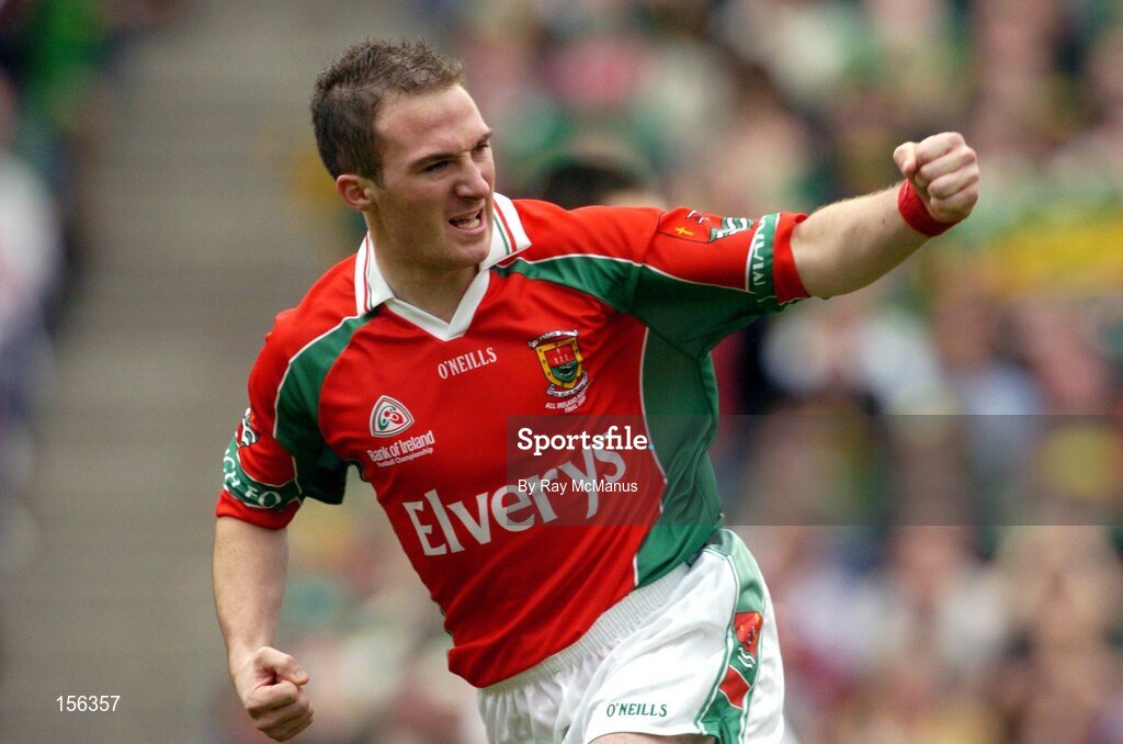 26 September 2004; Alan Dillon, Mayo, celebrates after scoring a goal for his side. Bank of Ireland All-Ireland Senior Football Championship Final, Kerry v Mayo, Croke Park, Dublin. Picture credit; Ray McManus / SPORTSFILE *** Local Caption *** Any photograph taken by SPORTSFILE during, or in connection with, the 2004 Bank of Ireland All-Ireland Senior Football Final which displays GAA logos or contains an image or part of an image of any GAA intellectual property, or, which contains images of a GAA player/players in their playing uniforms, may only be used for editorial and non-advertising purposes. Use of photographs for advertising, as posters or for purchase separately is strictly prohibited unless prior written approval has been obtained from the Gaelic Athletic Association.