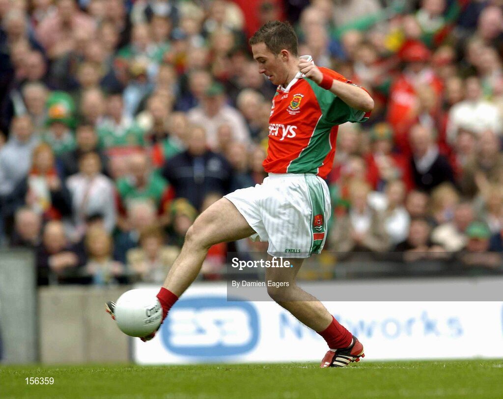26 September 2004; Mayo's Alan Dillon scores a goal for his side. Bank of Ireland All-Ireland Senior Football Championship Final, Kerry v Mayo, Croke Park, Dublin. Picture credit; Damien Eagers / SPORTSFILE *** Local Caption *** Any photograph taken by SPORTSFILE during, or in connection with, the 2004 Bank of Ireland All-Ireland Senior Football Final which displays GAA logos or contains an image or part of an image of any GAA intellectual property, or, which contains images of a GAA player/players in their playing uniforms, may only be used for editorial and non-advertising purposes. Use of photographs for advertising, as posters or for purchase separately is strictly prohibited unless prior written approval has been obtained from the Gaelic Athletic Association.