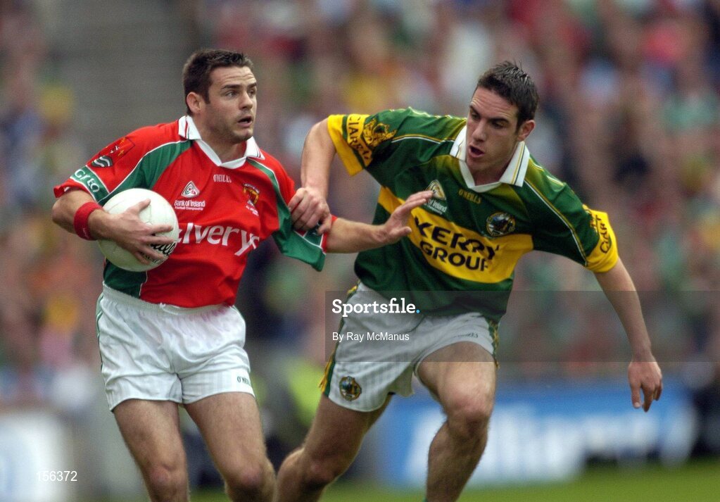 26 September 2004; Brian Maloney, Mayo, in action against Declan O'Sullivan, Kerry. Bank of Ireland All-Ireland Senior Football Championship Final, Kerry v Mayo, Croke Park, Dublin. Picture credit; Ray McManus / SPORTSFILE *** Local Caption *** Any photograph taken by SPORTSFILE during, or in connection with, the 2004 Bank of Ireland All-Ireland Senior Football Final which displays GAA logos or contains an image or part of an image of any GAA intellectual property, or, which contains images of a GAA player/players in their playing uniforms, may only be used for editorial and non-advertising purposes. Use of photographs for advertising, as posters or for purchase separately is strictly prohibited unless prior written approval has been obtained from the Gaelic Athletic Association.