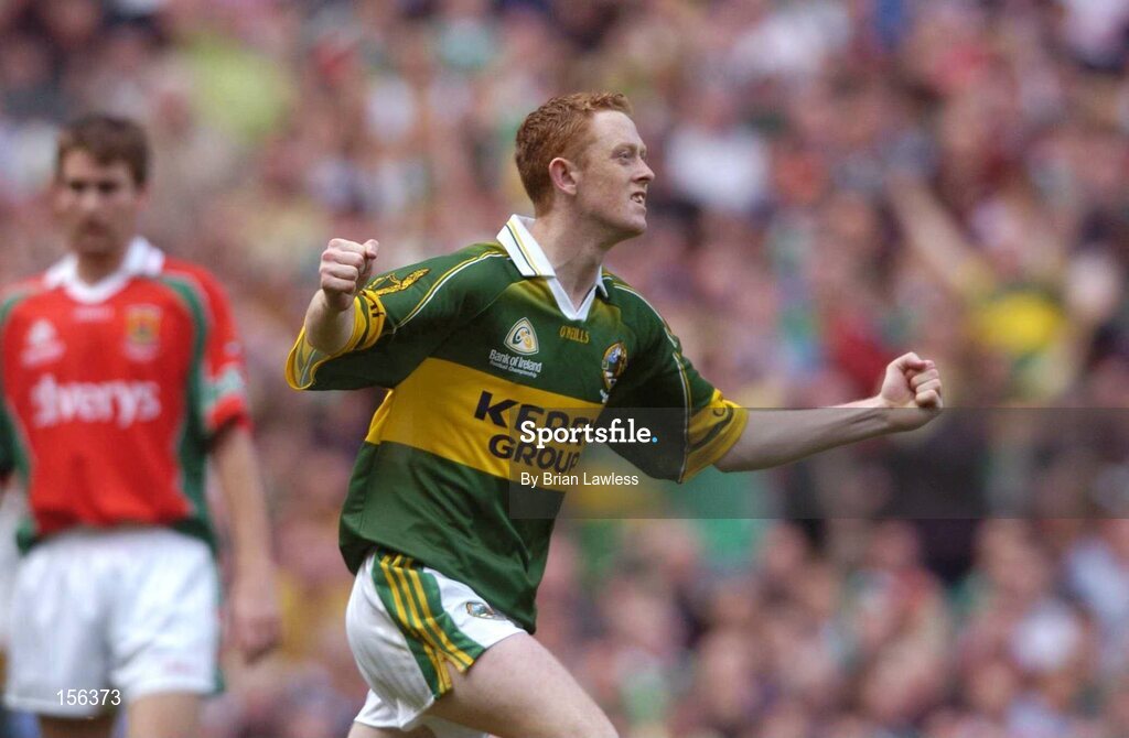 26 September 2004; Colm Cooper, Kerry, celebrates after scoring his sides first goal. Bank of Ireland All-Ireland Senior Football Championship Final, Kerry v Mayo, Croke Park, Dublin. Picture credit; Brian Lawless / SPORTSFILE *** Local Caption *** Any photograph taken by SPORTSFILE during, or in connection with, the 2004 Bank of Ireland All-Ireland Senior Football Final which displays GAA logos or contains an image or part of an image of any GAA intellectual property, or, which contains images of a GAA player/players in their playing uniforms, may only be used for editorial and non-advertising purposes. Use of photographs for advertising, as posters or for purchase separately is strictly prohibited unless prior written approval has been obtained from the Gaelic Athletic Association.