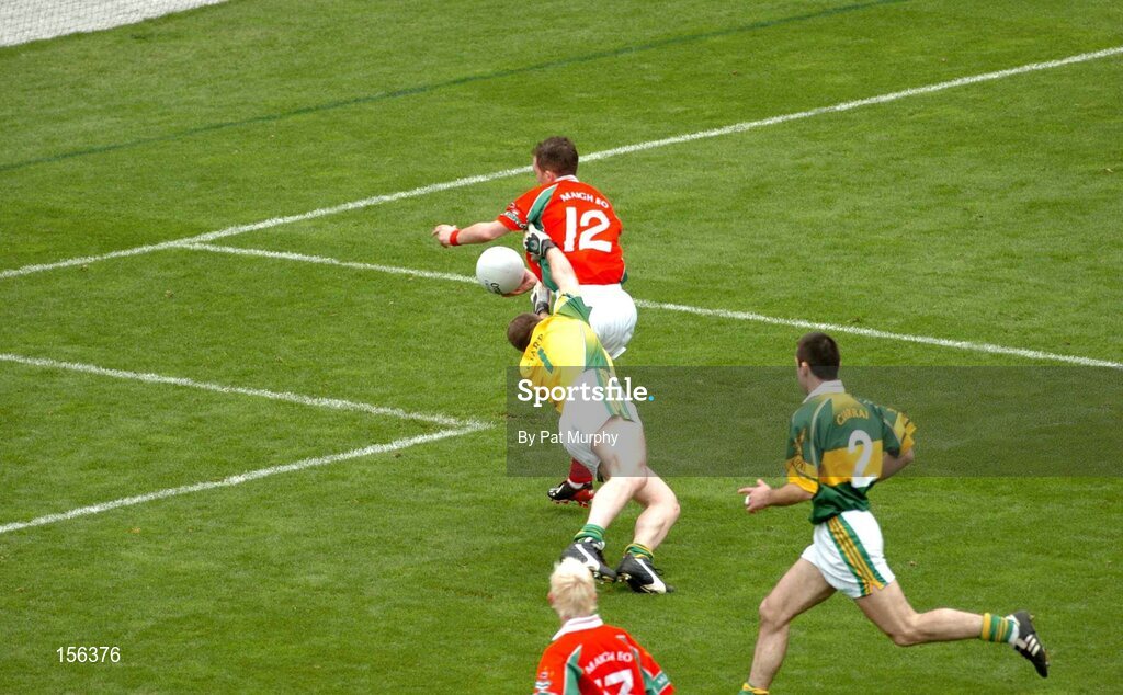26 September 2004; Alan Dillon, Mayo, goes past the challenge of Kerry goalkeeper Diarmuid Murphy to score his sides first goal. Bank of Ireland All-Ireland Senior Football Championship Final, Kerry v Mayo, Croke Park, Dublin. Picture credit; Pat Murphy / SPORTSFILE *** Local Caption *** Any photograph taken by SPORTSFILE during, or in connection with, the 2004 Bank of Ireland All-Ireland Senior Football Final which displays GAA logos or contains an image or part of an image of any GAA intellectual property, or, which contains images of a GAA player/players in their playing uniforms, may only be used for editorial and non-advertising purposes. Use of photographs for advertising, as posters or for purchase separately is strictly prohibited unless prior written approval has been obtained from the Gaelic Athletic Association.
