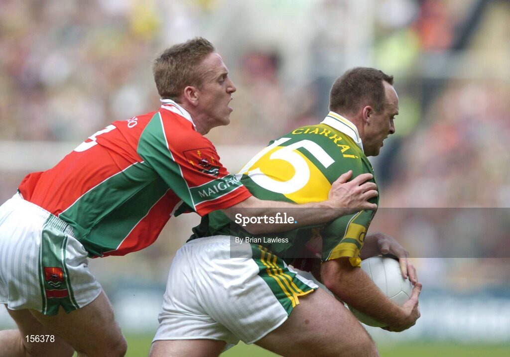 26 September 2004; John Crowley, Kerry, in action against David Heaney, Mayo. Bank of Ireland All-Ireland Senior Football Championship Final, Kerry v Mayo, Croke Park, Dublin. Picture credit; Brian Lawless / SPORTSFILE *** Local Caption *** Any photograph taken by SPORTSFILE during, or in connection with, the 2004 Bank of Ireland All-Ireland Senior Football Final which displays GAA logos or contains an image or part of an image of any GAA intellectual property, or, which contains images of a GAA player/players in their playing uniforms, may only be used for editorial and non-advertising purposes. Use of photographs for advertising, as posters or for purchase separately is strictly prohibited unless prior written approval has been obtained from the Gaelic Athletic Association.