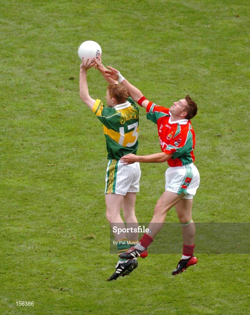 26 September 2004; Colm Cooper, Kerry, in action against Dermot Geraghty, Mayo. Bank of Ireland All-Ireland Senior Football Championship Final, Kerry v Mayo, Croke Park, Dublin. Picture credit; Pat Murphy / SPORTSFILE *** Local Caption *** Any photograph taken by SPORTSFILE during, or in connection with, the 2004 Bank of Ireland All-Ireland Senior Football Final which displays GAA logos or contains an image or part of an image of any GAA intellectual property, or, which contains images of a GAA player/players in their playing uniforms, may only be used for editorial and non-advertising purposes. Use of photographs for advertising, as posters or for purchase separately is strictly prohibited unless prior written approval has been obtained from the Gaelic Athletic Association.