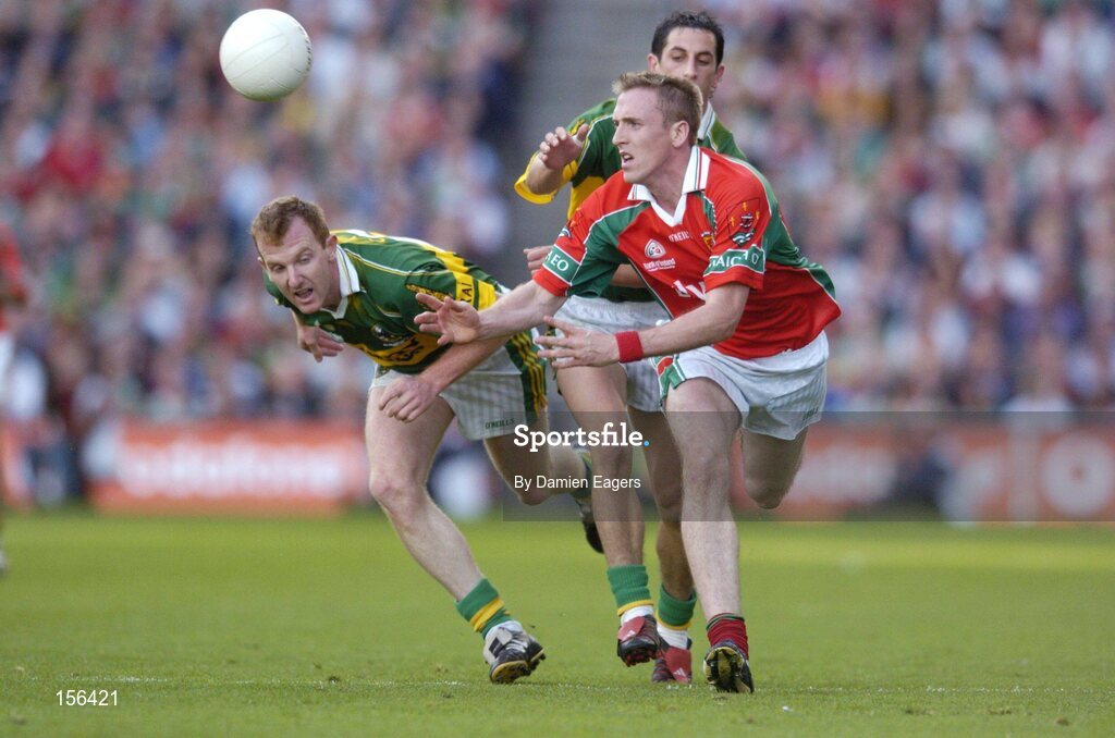 26 September 2004; David Heaney, Mayo, in action against Liam Hassett, Kerry. Bank of Ireland All-Ireland Senior Football Championship Final, Kerry v Mayo, Croke Park, Dublin. Picture credit; Damien Eagers / SPORTSFILE *** Local Caption *** Any photograph taken by SPORTSFILE during, or in connection with, the 2004 Bank of Ireland All-Ireland Senior Football Final which displays GAA logos or contains an image or part of an image of any GAA intellectual property, or, which contains images of a GAA player/players in their playing uniforms, may only be used for editorial and non-advertising purposes. Use of photographs for advertising, as posters or for purchase separately is strictly prohibited unless prior written approval has been obtained from the Gaelic Athletic Association.