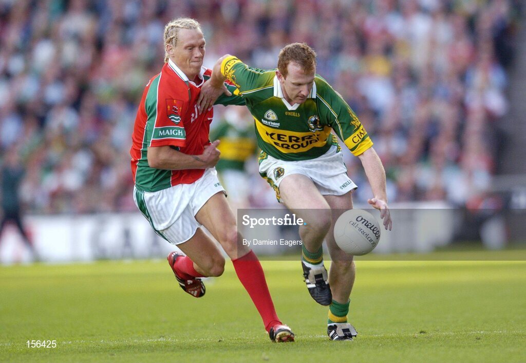 26 September 2004; Liam Hassett, Kerry, in action against Kieran McDonald, Mayo. Bank of Ireland All-Ireland Senior Football Championship Final, Kerry v Mayo, Croke Park, Dublin. Picture credit; Damien Eagers / SPORTSFILE *** Local Caption *** Any photograph taken by SPORTSFILE during, or in connection with, the 2004 Bank of Ireland All-Ireland Senior Football Final which displays GAA logos or contains an image or part of an image of any GAA intellectual property, or, which contains images of a GAA player/players in their playing uniforms, may only be used for editorial and non-advertising purposes. Use of photographs for advertising, as posters or for purchase separately is strictly prohibited unless prior written approval has been obtained from the Gaelic Athletic Association.