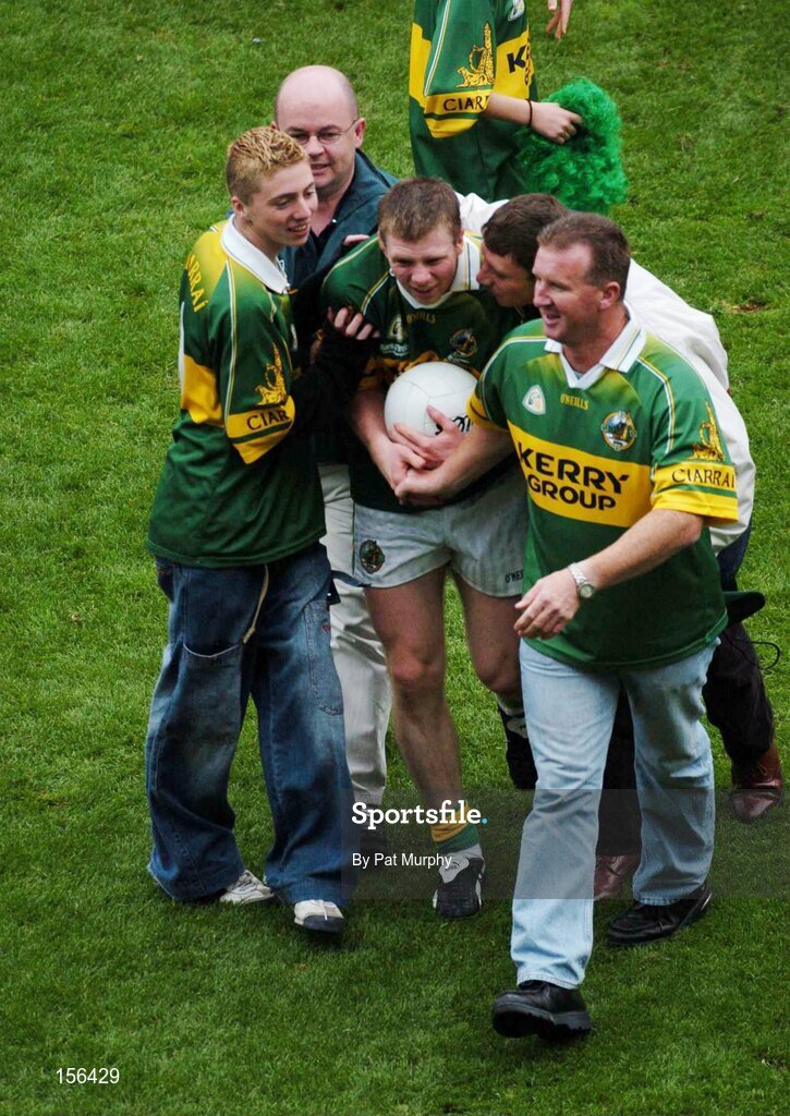 26 September 2004; Tomas O'Se, Kerry, is congratulated by supporters after victory over Mayo. Bank of Ireland All-Ireland Senior Football Championship Final, Kerry v Mayo, Croke Park, Dublin. Picture credit; Pat Murphy / SPORTSFILE *** Local Caption *** Any photograph taken by SPORTSFILE during, or in connection with, the 2004 Bank of Ireland All-Ireland Senior Football Final which displays GAA logos or contains an image or part of an image of any GAA intellectual property, or, which contains images of a GAA player/players in their playing uniforms, may only be used for editorial and non-advertising purposes. Use of photographs for advertising, as posters or for purchase separately is strictly prohibited unless prior written approval has been obtained from the Gaelic Athletic Association.