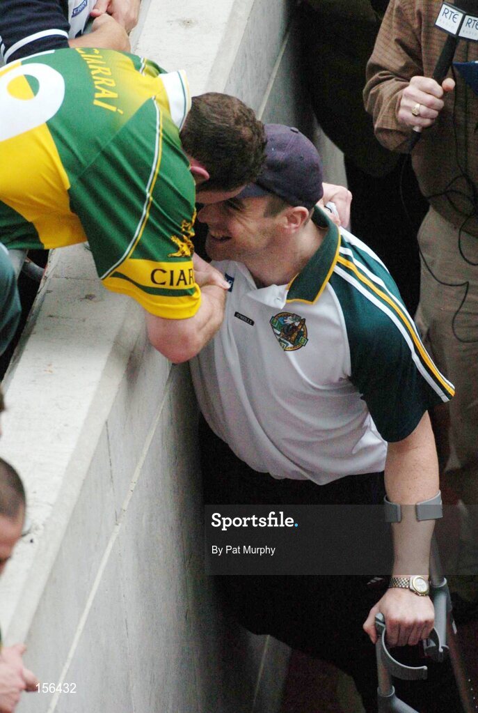 26 September 2004; Kerry team-mates Darragh Ó Sé and Seamus Moynihan, left, celebrate after victory over Mayo. Bank of Ireland All-Ireland Senior Football Championship Final, Kerry v Mayo, Croke Park, Dublin. Picture credit; Pat Murphy / SPORTSFILE *** Local Caption *** Any photograph taken by SPORTSFILE during, or in connection with, the 2004 Bank of Ireland All-Ireland Senior Football Final which displays GAA logos or contains an image or part of an image of any GAA intellectual property, or, which contains images of a GAA player/players in their playing uniforms, may only be used for editorial and non-advertising purposes. Use of photographs for advertising, as posters or for purchase separately is strictly prohibited unless prior written approval has been obtained from the Gaelic Athletic Association.