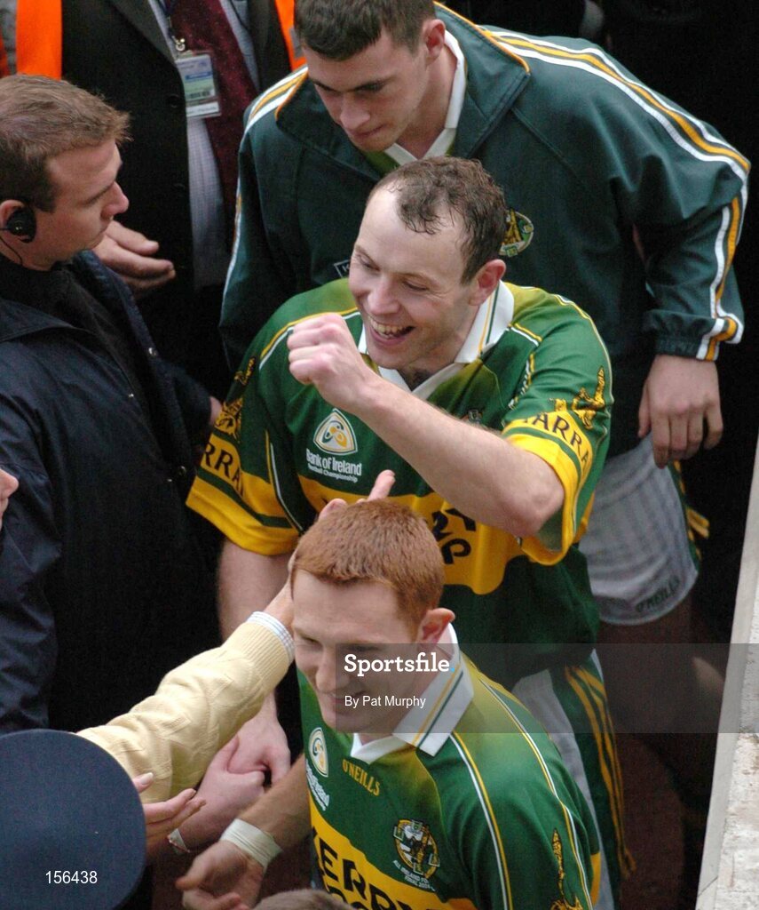 26 September 2004; Seamus Moynihan and Noel Kennelly, bottom, Kerry, celebrate victory over Mayo. Bank of Ireland All-Ireland Senior Football Championship Final, Kerry v Mayo, Croke Park, Dublin. Picture credit; Pat Murphy / SPORTSFILE *** Local Caption *** Any photograph taken by SPORTSFILE during, or in connection with, the 2004 Bank of Ireland All-Ireland Senior Football Final which displays GAA logos or contains an image or part of an image of any GAA intellectual property, or, which contains images of a GAA player/players in their playing uniforms, may only be used for editorial and non-advertising purposes. Use of photographs for advertising, as posters or for purchase separately is strictly prohibited unless prior written approval has been obtained from the Gaelic Athletic Association.
