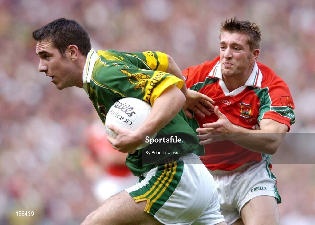26 September 2004; Declan O'Sullivan, Kerry, in action against Dermot Geraghty, Mayo. Bank of Ireland All-Ireland Senior Football Championship Final, Kerry v Mayo, Croke Park, Dublin. Picture credit; Brian Lawless / SPORTSFILE *** Local Caption *** Any photograph taken by SPORTSFILE during, or in connection with, the 2004 Bank of Ireland All-Ireland Senior Football Final which displays GAA logos or contains an image or part of an image of any GAA intellectual property, or, which contains images of a GAA player/players in their playing uniforms, may only be used for editorial and non-advertising purposes. Use of photographs for advertising, as posters or for purchase separately is strictly prohibited unless prior written approval has been obtained from the Gaelic Athletic Association.