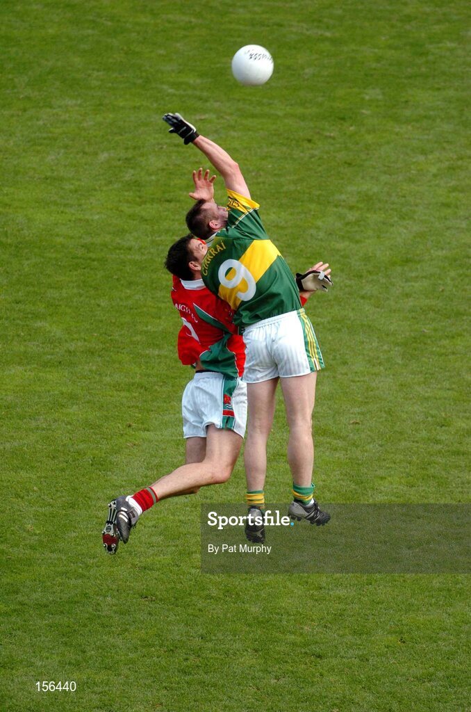 26 September 2004; William Kirby, Kerry, in action against Fergal Kelly, Mayo. Bank of Ireland All-Ireland Senior Football Championship Final, Kerry v Mayo, Croke Park, Dublin. Picture credit; Pat Murphy / SPORTSFILE *** Local Caption *** Any photograph taken by SPORTSFILE during, or in connection with, the 2004 Bank of Ireland All-Ireland Senior Football Final which displays GAA logos or contains an image or part of an image of any GAA intellectual property, or, which contains images of a GAA player/players in their playing uniforms, may only be used for editorial and non-advertising purposes. Use of photographs for advertising, as posters or for purchase separately is strictly prohibited unless prior written approval has been obtained from the Gaelic Athletic Association.