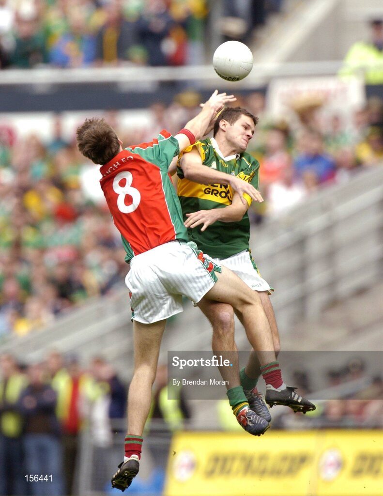 26 September 2004; Eoin Brosnan, Kerry, in action against Ronan McGarrity, Mayo. Bank of Ireland All-Ireland Senior Football Championship Final, Kerry v Mayo, Croke Park, Dublin. Picture credit; Brendan Moran / SPORTSFILE *** Local Caption *** Any photograph taken by SPORTSFILE during, or in connection with, the 2004 Bank of Ireland All-Ireland Senior Football Final which displays GAA logos or contains an image or part of an image of any GAA intellectual property, or, which contains images of a GAA player/players in their playing uniforms, may only be used for editorial and non-advertising purposes. Use of photographs for advertising, as posters or for purchase separately is strictly prohibited unless prior written approval has been obtained from the Gaelic Athletic Association.