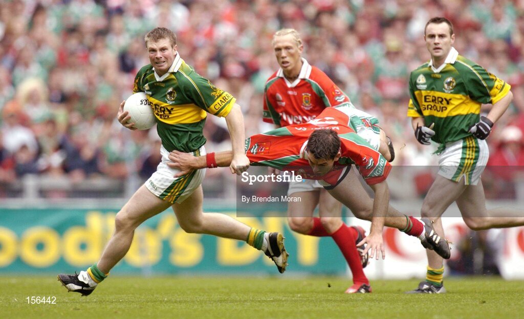 26 September 2004; Tomas O Se, Kerry, in action against Fergal Kelly, Mayo. Bank of Ireland All-Ireland Senior Football Championship Final, Kerry v Mayo, Croke Park, Dublin. Picture credit; Brendan Moran / SPORTSFILE *** Local Caption *** Any photograph taken by SPORTSFILE during, or in connection with, the 2004 Bank of Ireland All-Ireland Senior Football Final which displays GAA logos or contains an image or part of an image of any GAA intellectual property, or, which contains images of a GAA player/players in their playing uniforms, may only be used for editorial and non-advertising purposes. Use of photographs for advertising, as posters or for purchase separately is strictly prohibited unless prior written approval has been obtained from the Gaelic Athletic Association.