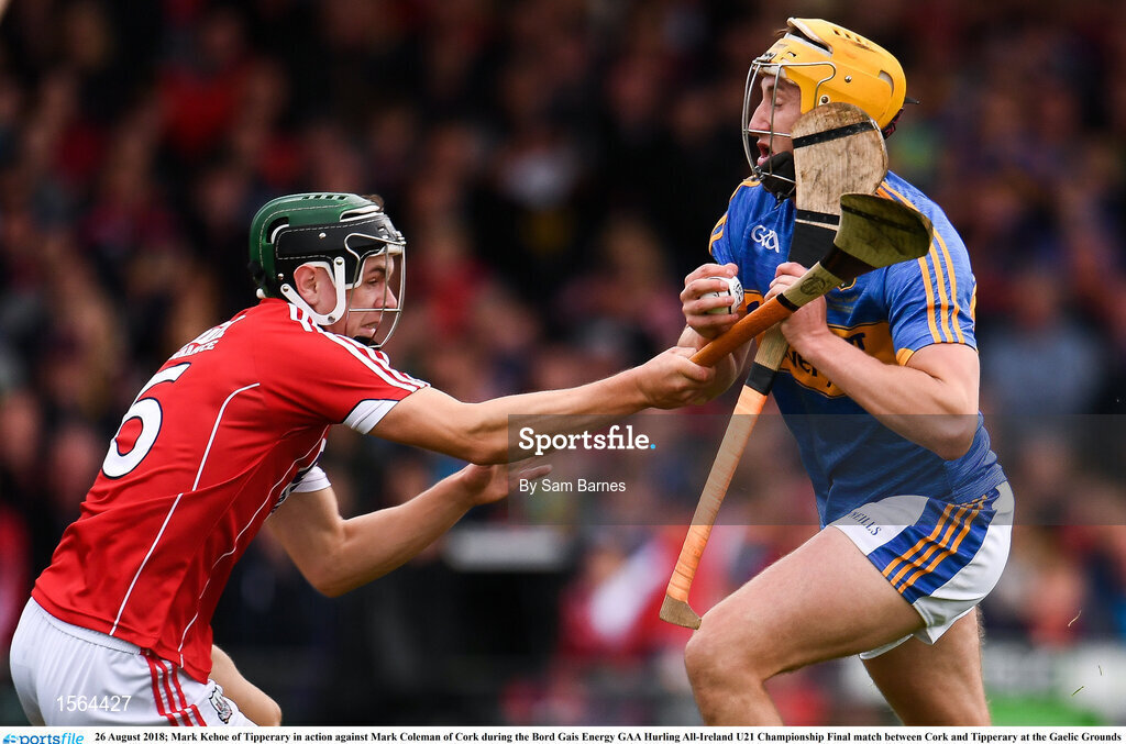 26 August 2018; Mark Kehoe of Tipperary in action against Mark Coleman of Cork during the Bord Gais Energy GAA Hurling All-Ireland U21 Championship Final match between Cork and Tipperary at the Gaelic Grounds in Limerick. Photo by Sam Barnes/Sportsfile