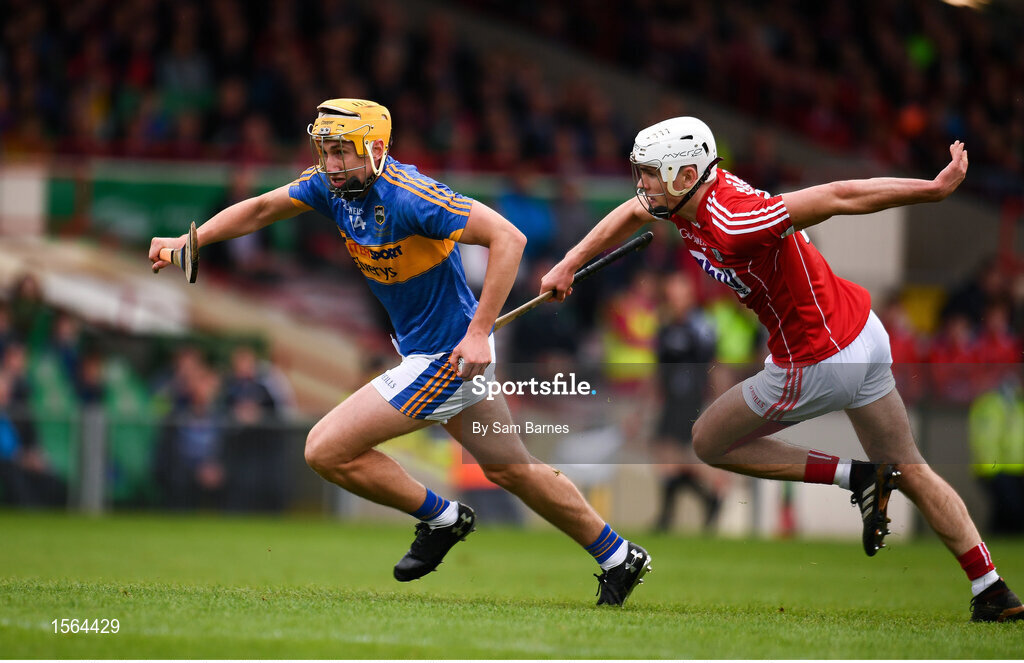 26 August 2018; Mark Kehoe of Tipperary in action against David Griffin of Cork during the Bord Gais Energy GAA Hurling All-Ireland U21 Championship Final match between Cork and Tipperary at the Gaelic Grounds in Limerick. Photo by Sam Barnes/Sportsfile