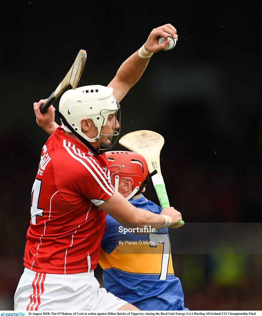 26 August 2018; Tim O’Mahony of Cork in action against Dillon Quirke of Tipperary during the Bord Gais Energy GAA Hurling All-Ireland U21 Championship Final match between Cork and Tipperary at the Gaelic Grounds in Limerick. Photo by Piaras Ó Mídheach/Sportsfile