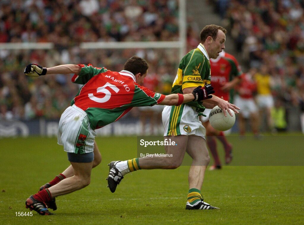 26 September 2004; Seamus Moynihan, Kerry, in action against Peadar Gardnier, Mayo. Bank of Ireland All-Ireland Senior Football Championship Final, Kerry v Mayo, Croke Park, Dublin. Picture credit; Ray McManus / SPORTSFILE *** Local Caption *** Any photograph taken by SPORTSFILE during, or in connection with, the 2004 Bank of Ireland All-Ireland Senior Football Final which displays GAA logos or contains an image or part of an image of any GAA intellectual property, or, which contains images of a GAA player/players in their playing uniforms, may only be used for editorial and non-advertising purposes. Use of photographs for advertising, as posters or for purchase separately is strictly prohibited unless prior written approval has been obtained from the Gaelic Athletic Association.