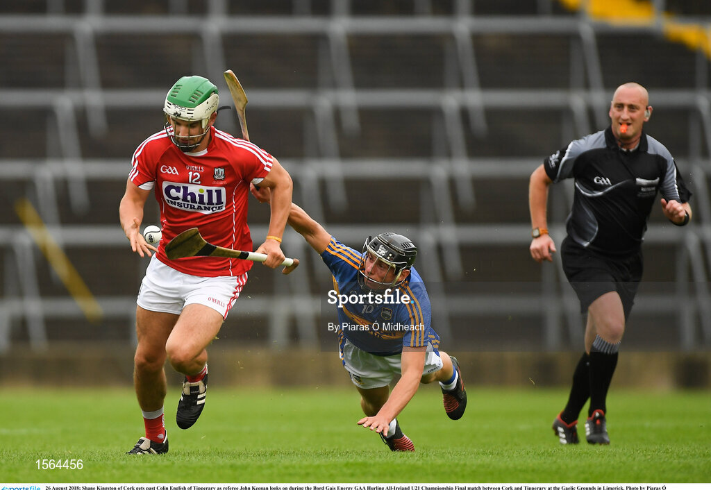 26 August 2018; Shane Kingston of Cork gets past Colin English of Tipperary as referee John Keenan looks on during the Bord Gais Energy GAA Hurling All-Ireland U21 Championship Final match between Cork and Tipperary at the Gaelic Grounds in Limerick. Photo by Piaras Ó Mídheach/Sportsfile