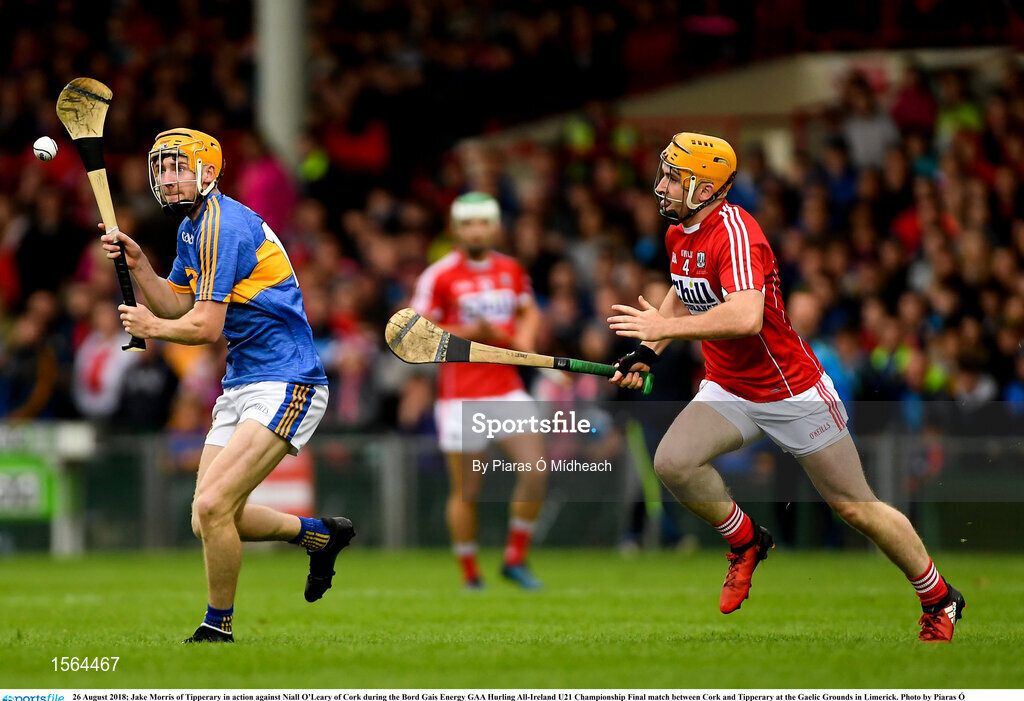 26 August 2018; Jake Morris of Tipperary in action against Niall O’Leary of Cork during the Bord Gais Energy GAA Hurling All-Ireland U21 Championship Final match between Cork and Tipperary at the Gaelic Grounds in Limerick. Photo by Piaras Ó Mídheach/Sportsfile