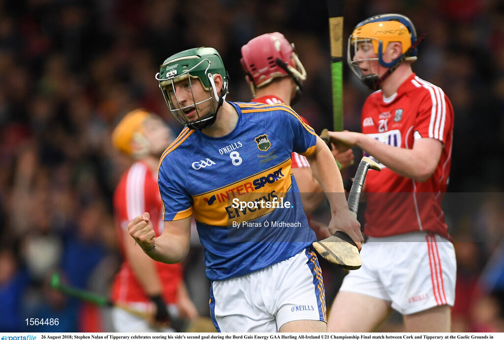 26 August 2018; Stephen Nolan of Tipperary celebrates scoring his side's second goal during the Bord Gais Energy GAA Hurling All-Ireland U21 Championship Final match between Cork and Tipperary at the Gaelic Grounds in Limerick. Photo by Piaras Ó Mídheach/Sportsfile