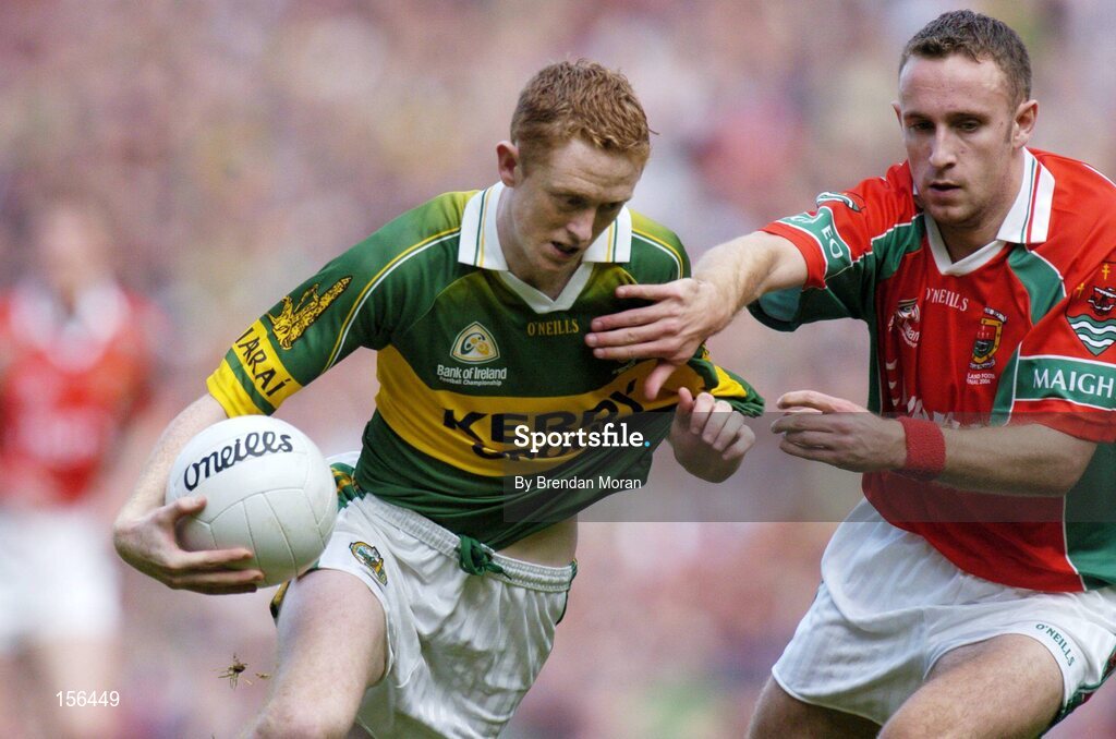 26 September 2004; Colm Cooper, Kerry, in action against Pat Kelly, Mayo. Bank of Ireland All-Ireland Senior Football Championship Final, Kerry v Mayo, Croke Park, Dublin. Picture credit; Brendan Moran / SPORTSFILE *** Local Caption *** Any photograph taken by SPORTSFILE during, or in connection with, the 2004 Bank of Ireland All-Ireland Senior Football Final which displays GAA logos or contains an image or part of an image of any GAA intellectual property, or, which contains images of a GAA player/players in their playing uniforms, may only be used for editorial and non-advertising purposes. Use of photographs for advertising, as posters or for purchase separately is strictly prohibited unless prior written approval has been obtained from the Gaelic Athletic Association.